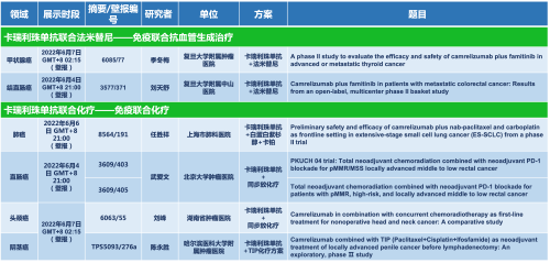 卡瑞利珠单抗联合AG庄闲医药的另一款创新药法米替尼在甲状腺癌和结直肠癌领域有2项研究被接收为壁报,另有卡瑞利珠单抗联合化疗的4项研究在肺癌、结直肠癌、头颈癌和阴茎癌领域的研究被接收为5份壁报。