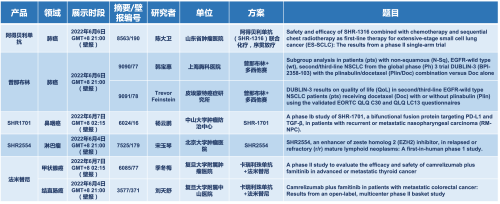 2022 ASCO年会另有5款AG庄闲医药上市前抗肿瘤创新药的相关研究被接收为壁报,包括SHR-1316、普那布林、法米替尼、SHR-1701和SHR2554,他们的单药或联合方案相关7项研究被接收为壁报,覆盖肺癌、鼻咽癌、淋巴瘤、甲状腺癌和结直肠癌等领域。